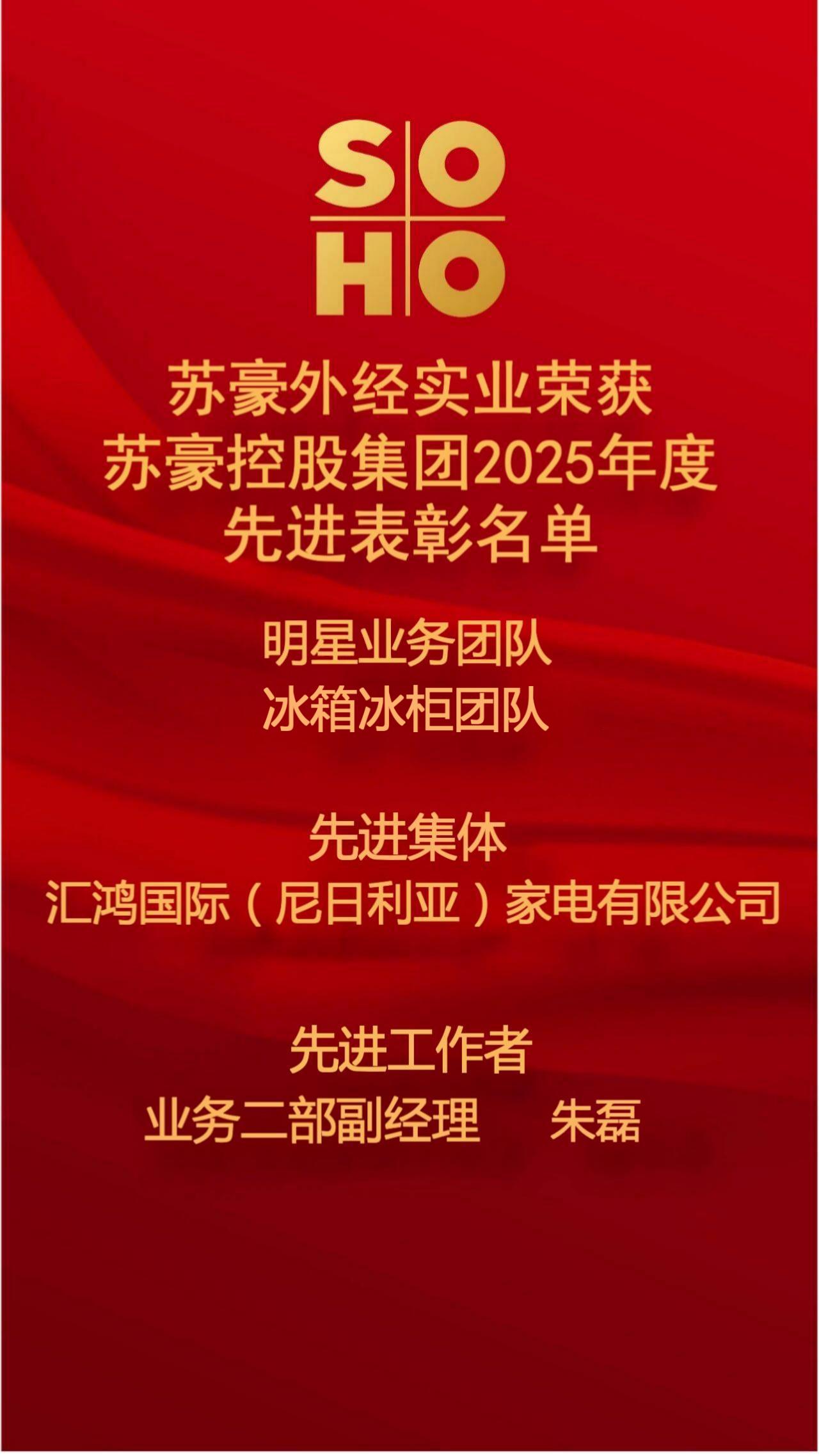 2月11日,苏豪控股集团召开2025年度先进表彰大会,苏豪外经实业公司业务二部朱磊荣获控股集团“2025年度先进工作者”,汇鸿国际(尼日利亚)家电有限公司荣获控股集团“2025年度先进集体”,冰箱冰柜团队荣获控股集团“2025年度明星业务团队”,这是公司首次在苏豪控股集团表彰大会上三箭齐发,这不仅是集团对公司深耕“一带一路”市场、坚持实体制造的肯定,更是以海外一线员工为代表的全体员工凝心聚力、攻坚克难的有力见证。